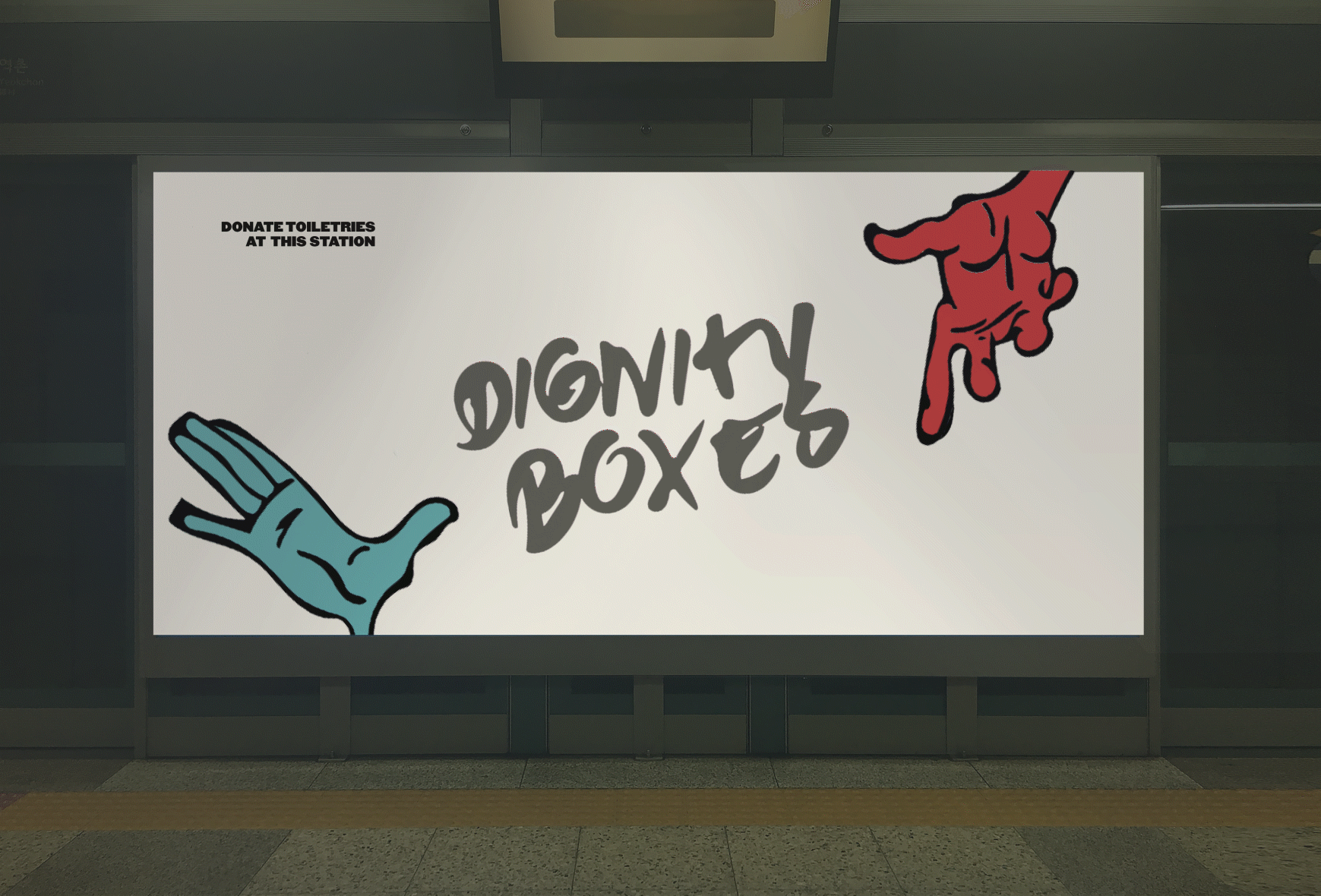 Dignity boxes is an Edinburgh based charity, supplying essential cleanliness products for those in need. They have a collection and drop off boxes in cafes and stores. I created a bold hand illustration as the base of the project, to grab the attention of those who can donate. Whilst steering away from stereotypes of what charity branding is supposed to be. A key focus was using the illustrations on the box itself, as some people using the box are illiterate. This lead me to split the box into sections for faster and easier access.
